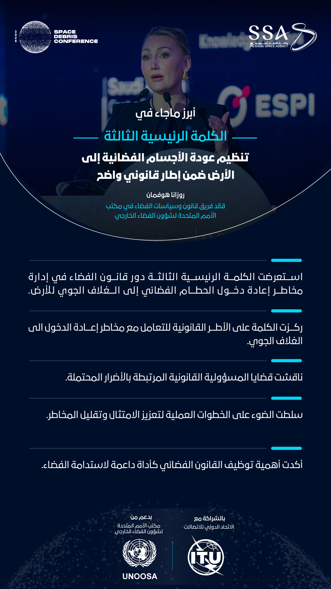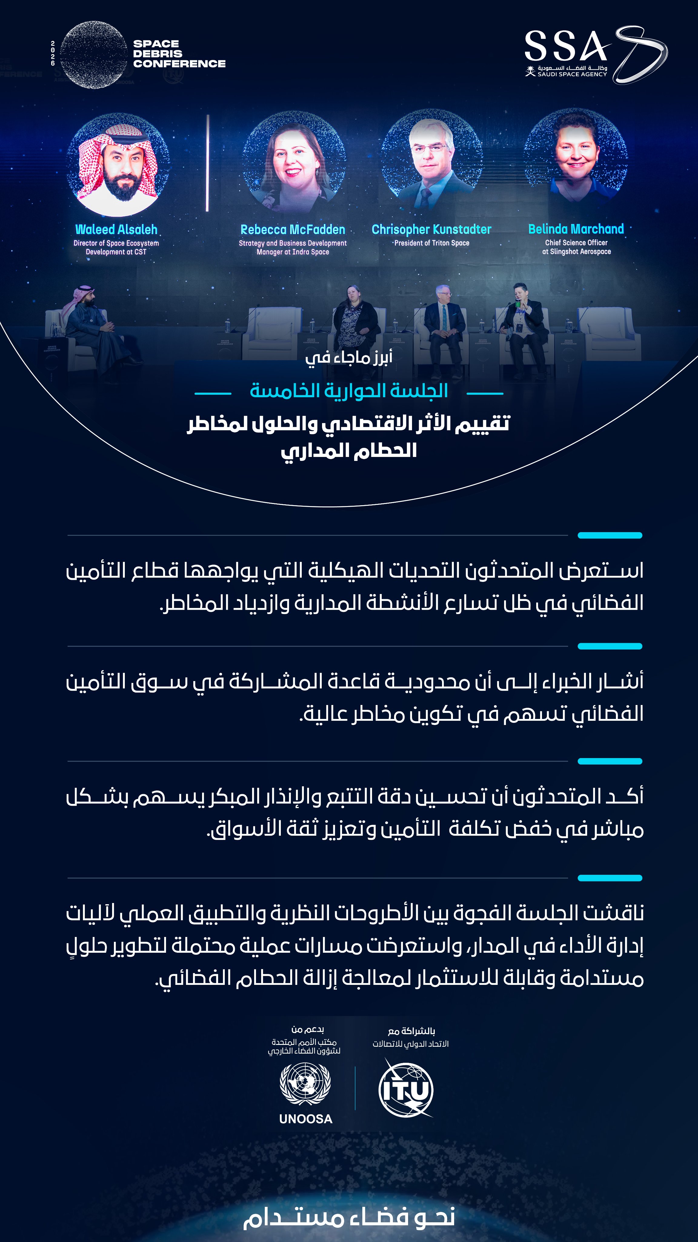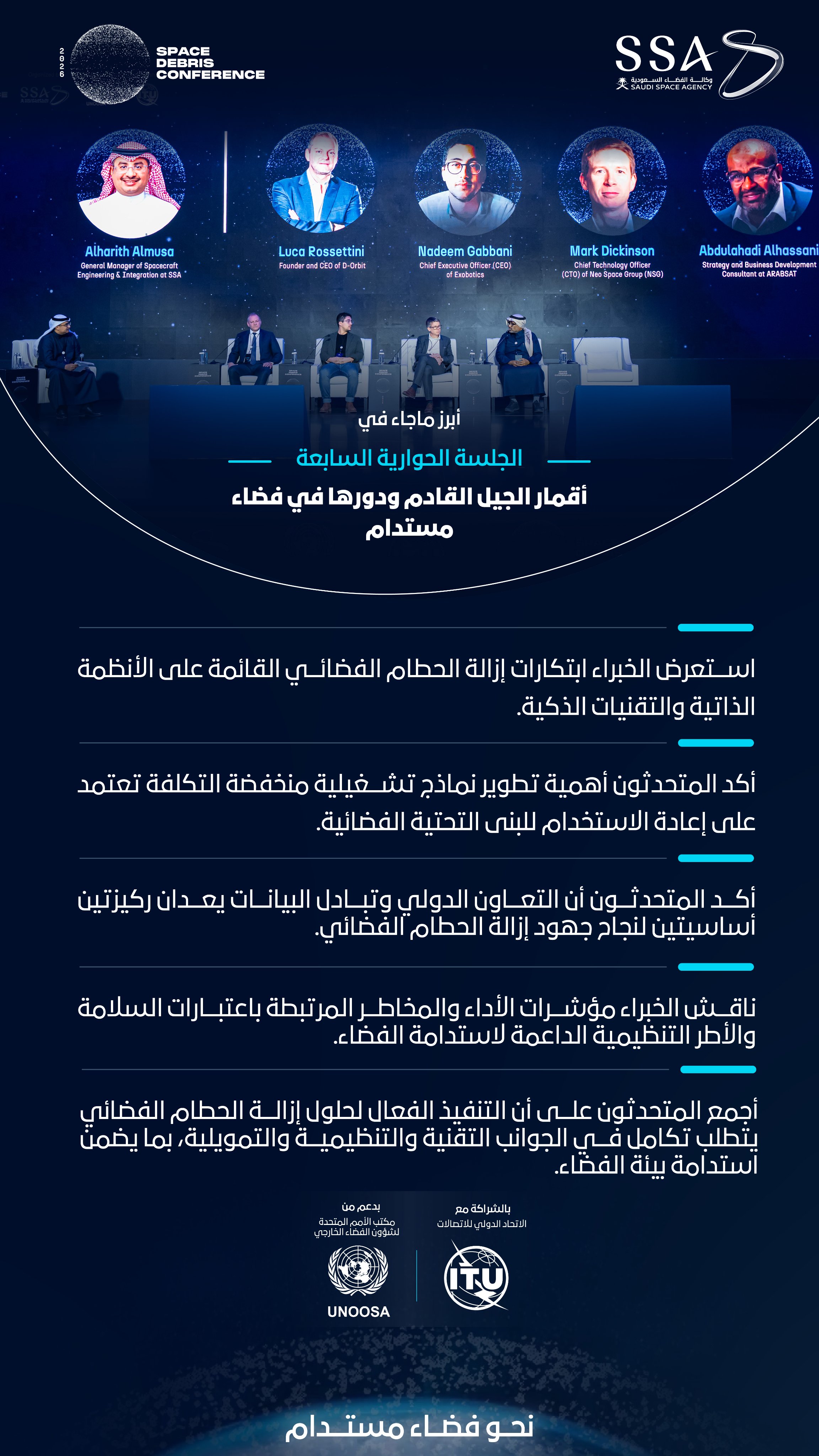 2026) بنجاح، حيث واصل البناء على النقاشات المهمة والرؤى الاستراتيجية التي خرجت بها النسخة السابقة، بما يعزز التعاون الدولي لمعالجة التحديات المتزايدة المرتبطة بالحطام الفضائي وضمان استدامة بيئة الفضاء.