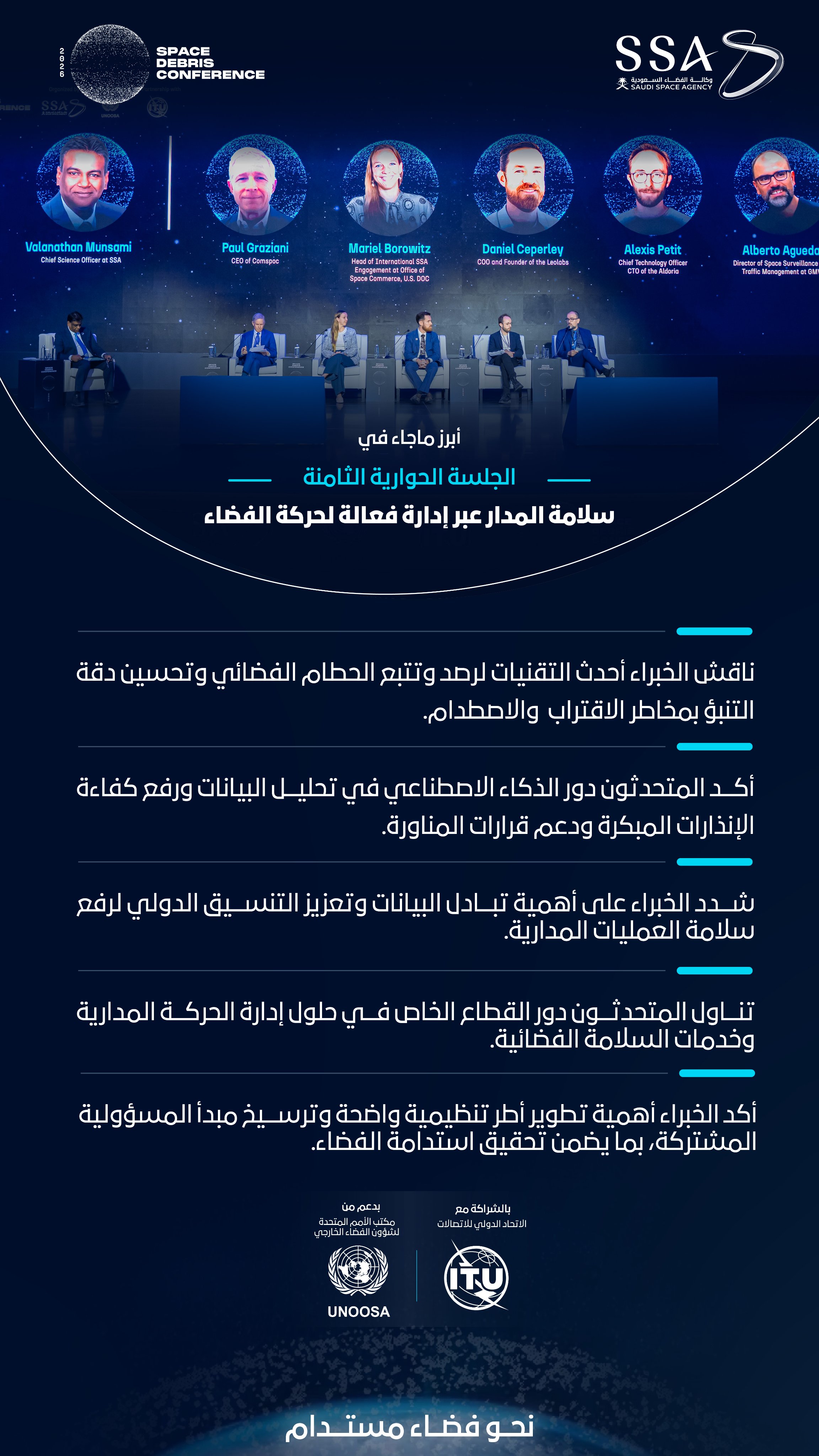| 14:50-14:00 | الجلسة الحوارية الثامنة | سلامة المدار عبر إدارة فعّالة لحركة الفضاء |
