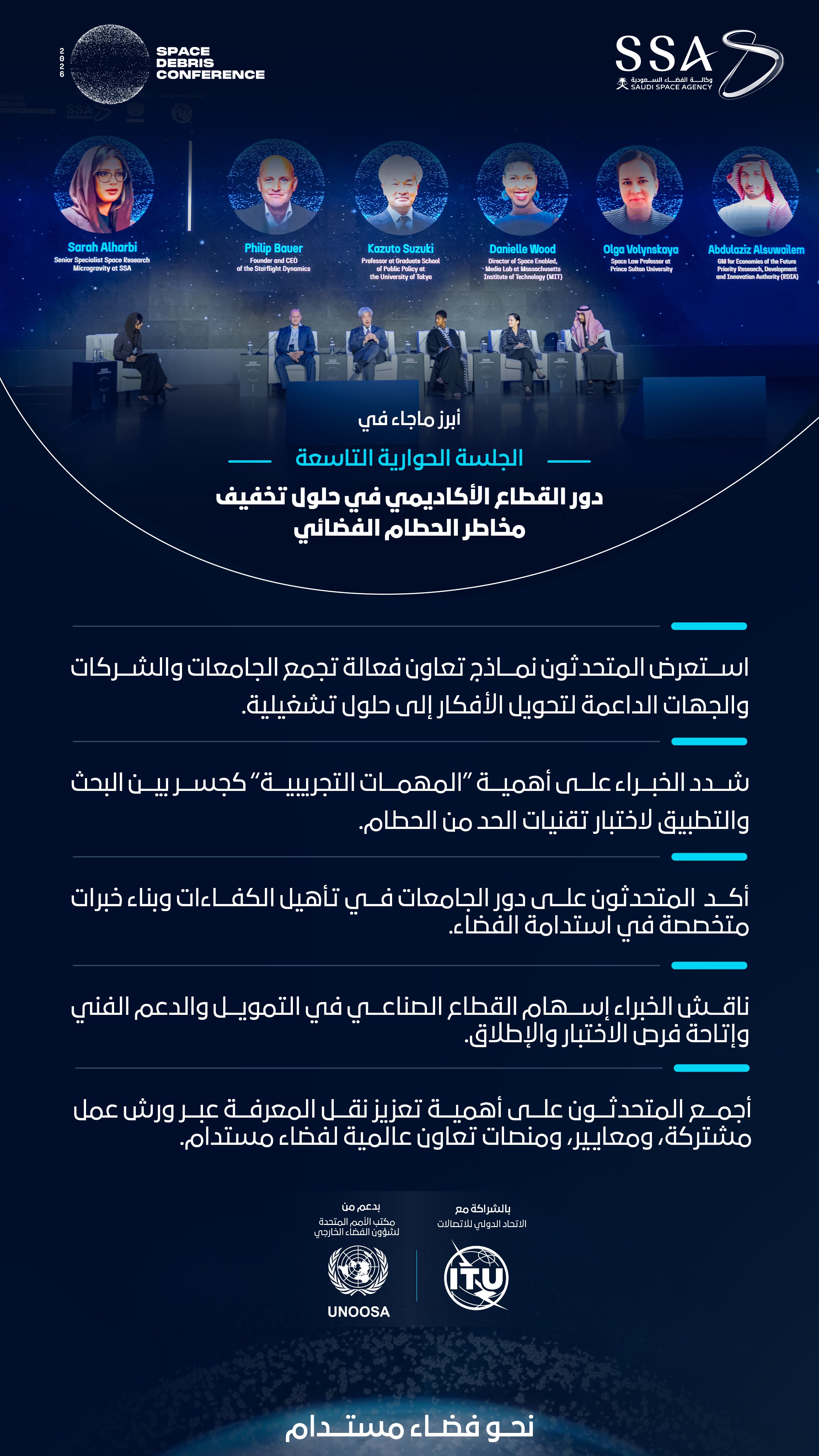 ندعوكم للانضمام إلى نقاشات ثرية وجهود تعاونية رائدة تهدف إلى تطوير استجابات عملية ومبتكرة تسهم في الحد من أزمة الحطام الفضائي، وتعزيز استدامة الفضاء للأجيال القادمة.